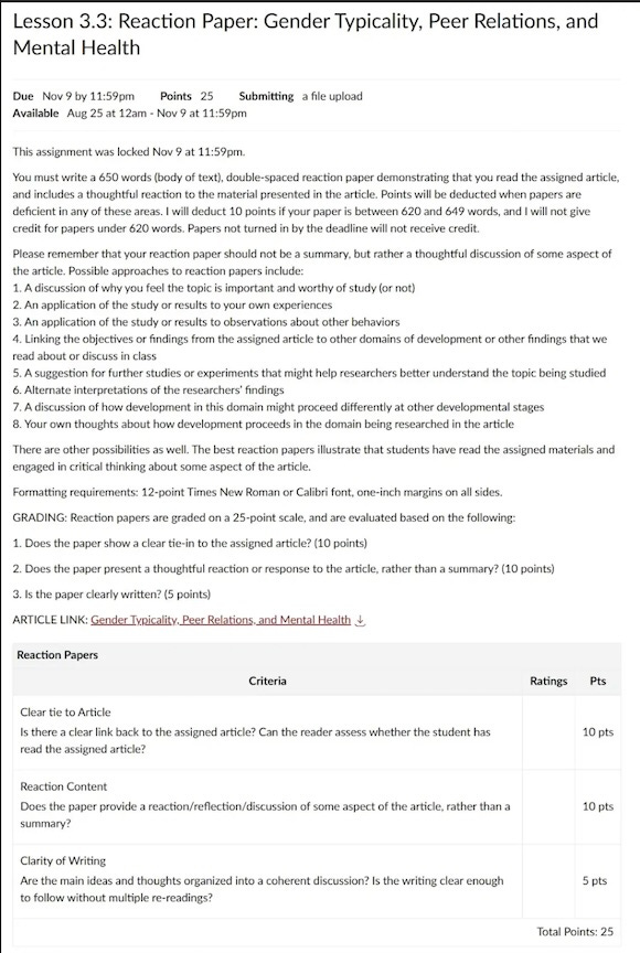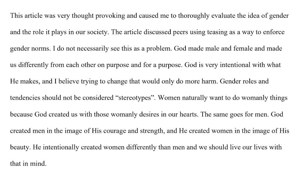 Fulnecky and her classmates were tasked with writing a response to a scholarly article titled “Relations Among Gender Typicality, Peer Relations, and Mental Health During Early Adolescence,” summarizing results of a study about gender norms among middle schoolers and the social ramifications children may face for not conforming to gender norms.